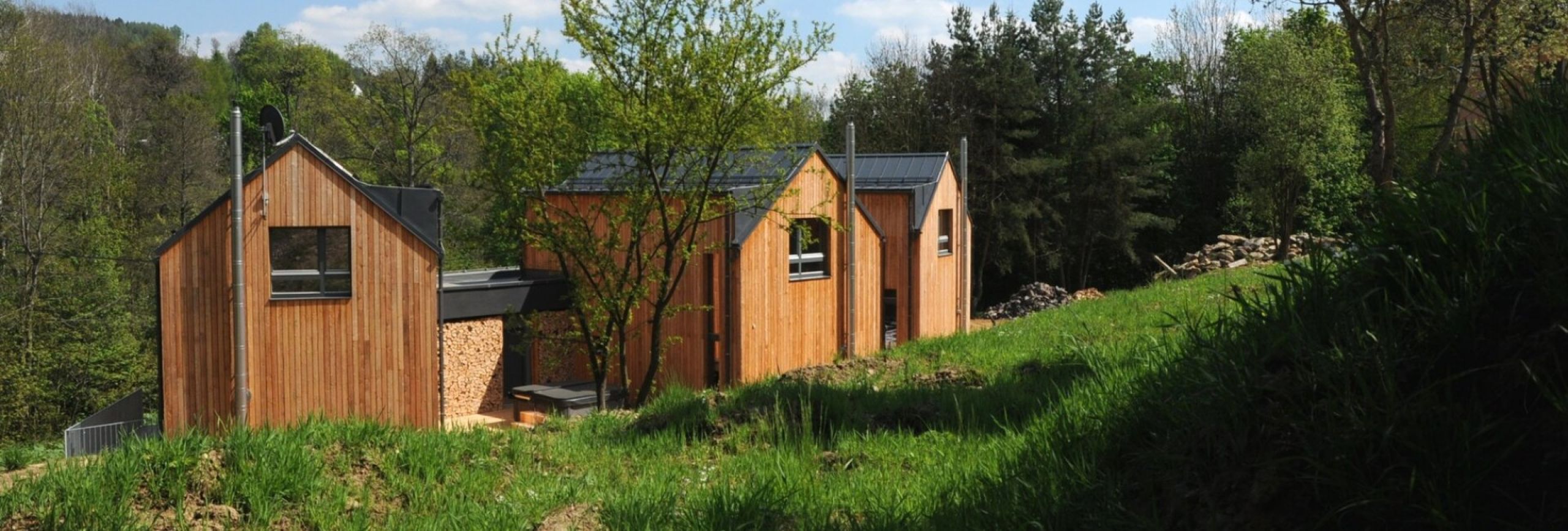 Area of each chalet is approx. 100 m2, there are two bedrooms, living room with a fireplace type stove, kitchen with a dining area, 2 toilets, a bathroom with a shower bath, 2 TV sets.