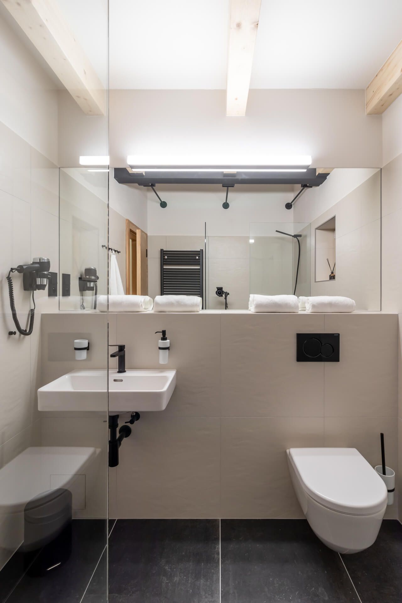 • Koupelna se sprchovým koutem, toaletou a fénem